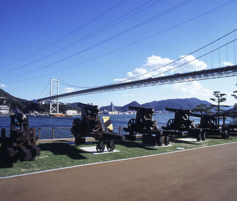 조류가 빠르다는 간몬 해협의 대표적인 경치를 바라볼 수 있는 공원. 에도 막부 말기의 전쟁에서 쵸슈번이 외국 선박에 포격한 포대 흔적이 남아 있습니다. 또한, 쵸슈포라고 불리는 대포의 원래 크기가 간몬 해협 쪽으로 전시되어 있으며, 그 중 1문은 소리와 연기의 연출을 즐길 수 있습니다. 원내에는 겐지와 헤이케의 단노우라 전투가 벌어진 것을 기리며, 미나모토노 요시츠네와 타이라노 토모노리의 상도 제작되어 있습니다. 타키자와 히데아키 씨 등 상의 제막식에 참가한 배우들의 손도장도 반드시 보아야할 것들입니다.