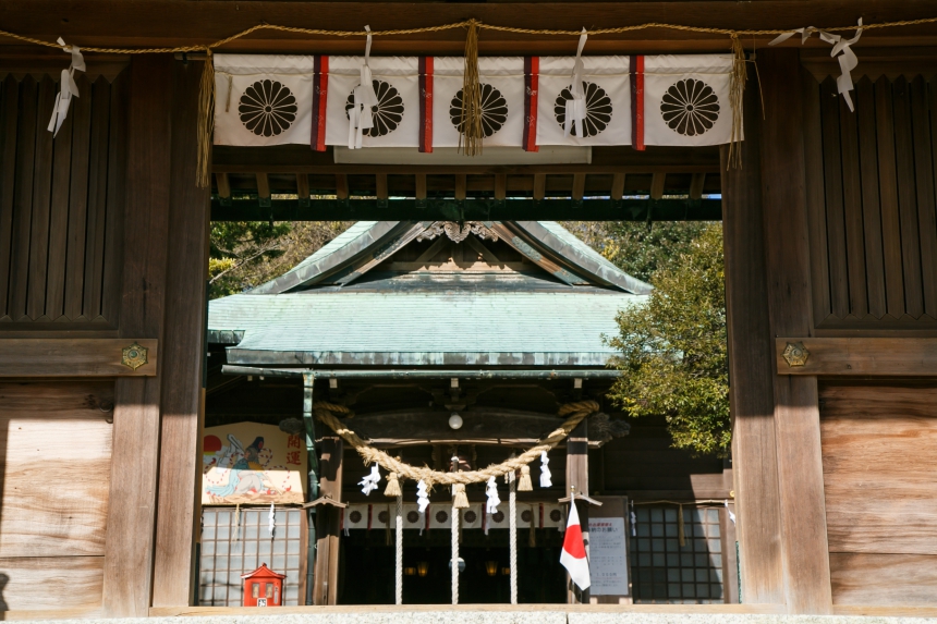 จากพงศาวดารญี่ปุ่นที่นี่เป็นสถานที่ซึ่งถูกสร้างเป็นที่พักชั่วคราวในระหว่างที่จักรพรรดิชูไอและจักรพรรดินีจิงกูเข้าปราบปรามตระกูลที่มีอำนาจในคิวชู ประทับอยู่ที่นี่ตั้งแต่ปี 193 - 200 เป็นเวลารวม 7 ปี ว่ากันว่าวังนี้ถูกทำลายจากเหตุการณ์ไฟไหม้ในยุคกลาง จากนั้นจึงได้กลายมาเป็นศาลเจ้าอิมิโนะมิยะ